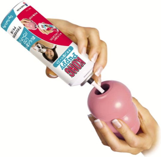 キャップの"PUSH BUTTON"(突起)を押しながら、上に取り外します。ノズルを斜め下に傾け、先端をコング内側面に向け、指でノズル中間部分を押して中身を出します。ノズルを強く押さえすぎると壊れる恐れがありますので、ご注意ください。尚、ドライフードにかけて更においしく、夏はコングにペーストを詰め凍らせた状態(アイスコング)としてもご利用できます。