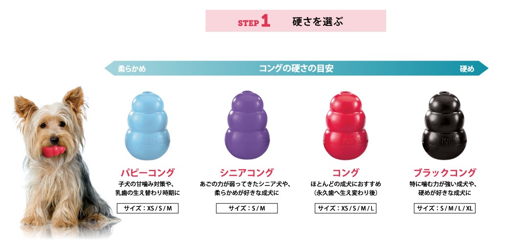 豊富な硬さやサイズから、愛犬にピッタリのコングを選びましょう。