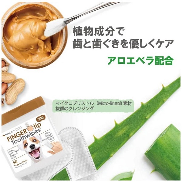 ペットが喜ぶ味と香りです(ピーナッツバター味)。ブラッシングやデンタル液を嫌がるペットにも。指にはめるタイプで、密度の細かいマイクロブリストル繊維(Micro-Bristol Fabric)のウェットシート。しっかり汚れを絡めとる進化した次世代。重曹とアロエベラエキス配合。歯だけでなく歯ぐきや舌のケアにも最適。PETKIN社は、世界で初めてペット用のウェットシートを開発した会社です。使用方法:1枚ずつ引きだして、指にはめてご使用ください。ご注意:子どもやペットの手の届かないところに保管してください。