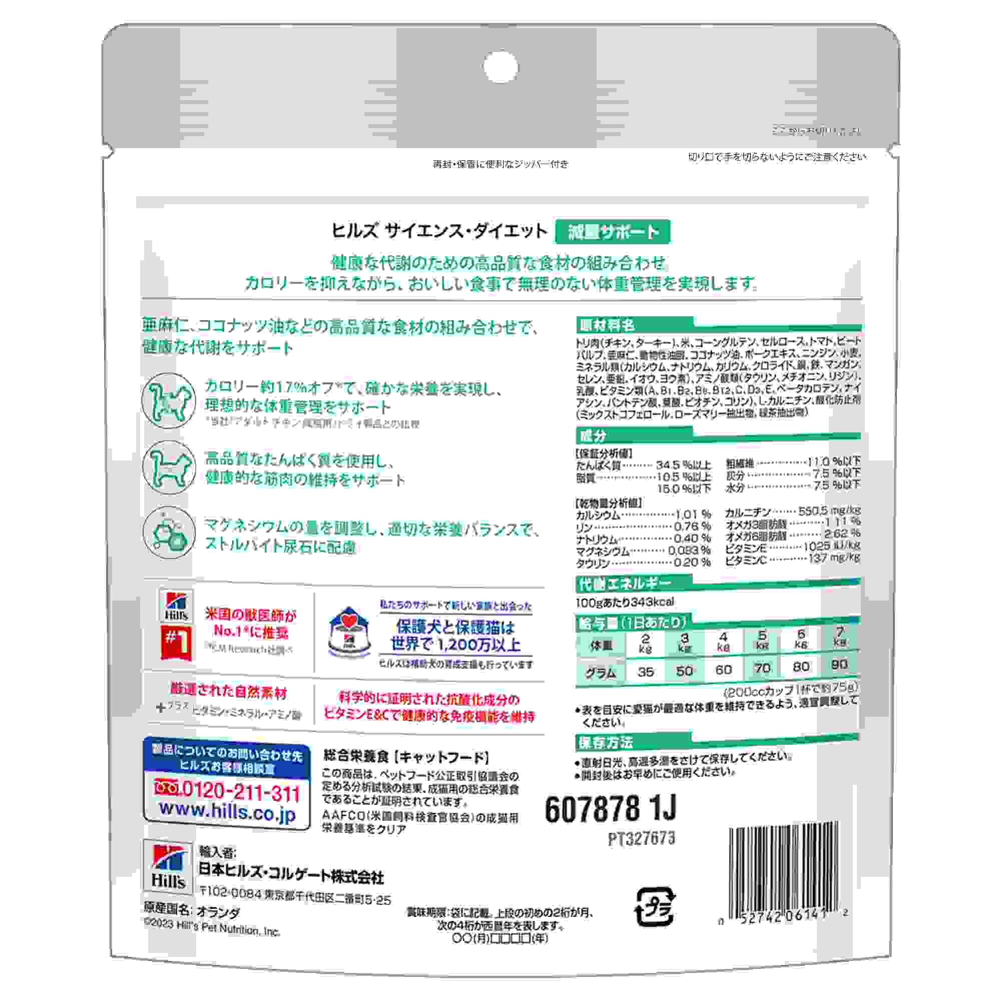 ヒルズ独自の低カロリーレシピ*で健康的な減量と体重管理をサポート*ヒルズ「アダルトチキン成猫用」ドライ製品と比較してカロリー約17%オフ健康な代謝のための高品質な食材の組み合わせ