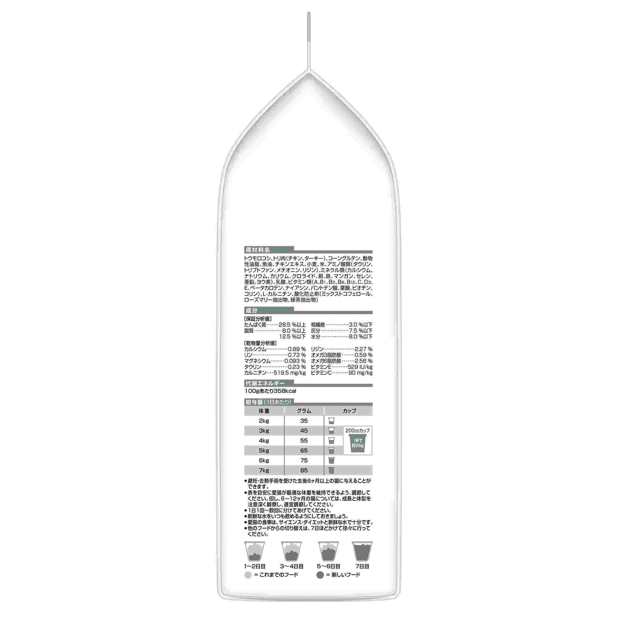 トウモロコシ、トリ肉(チキン、ターキー)、コーングルテン、動物性油脂、魚油、チキンエキス、小麦、米、アミノ酸類(タウリン、トリプトファン、メチオニン、リジン)、ミネラル類(カルシウム、ナトリウム、カリウム、クロライド、銅、鉄、マンガン、セレン、亜鉛、ヨウ素)、乳酸、ビタミン類(A、B1、B2、B6、B12、C、D3、E、ベータカロテン、ナイアシン、パントテン酸、葉酸、ビオチン、コリン)、Lーカルニチン、酸化防止剤(ミックストコフェロール、ローズマリー抽出物、緑茶抽出物)