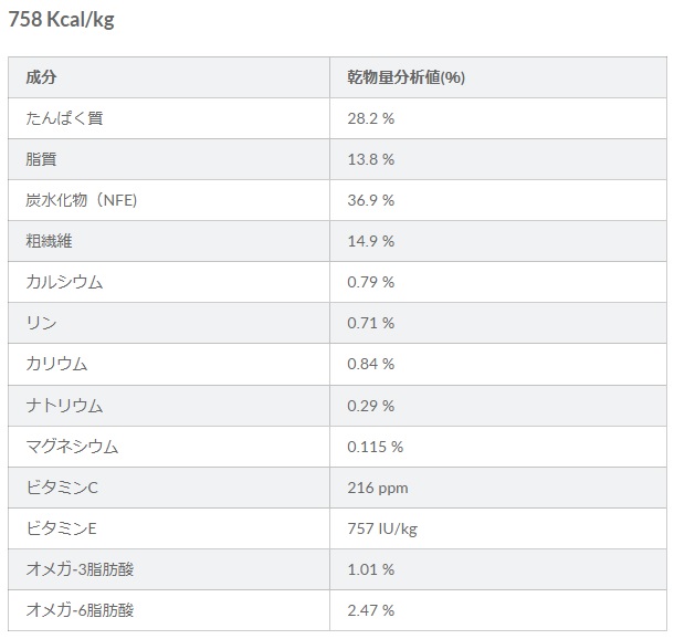 乾物量分析値(%)は平均的な値を表示しているため、パッケージに記載されている値と多少異なる場合がありますので、ご了承ください。