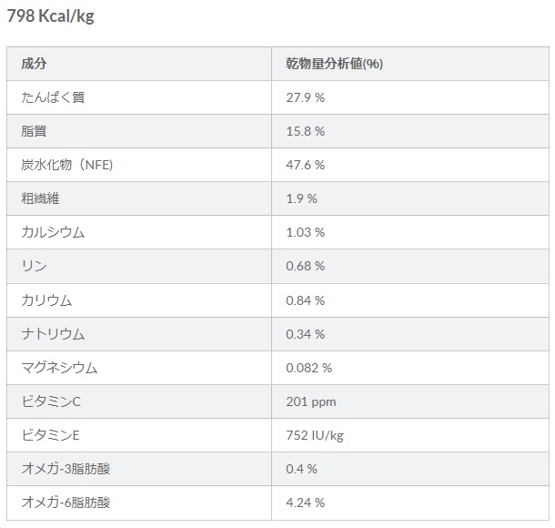 乾物量分析値(%)は平均的な値を表示しているため、パッケージに記載されている値と多少異なる場合がありますので、ご了承ください。