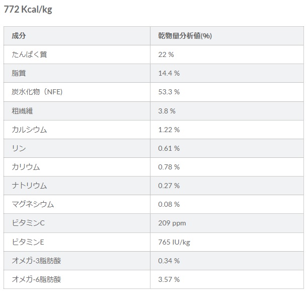 乾物量分析値(%)は平均的な値を表示しているため、パッケージに記載されている値と多少異なる場合がありますので、ご了承ください。