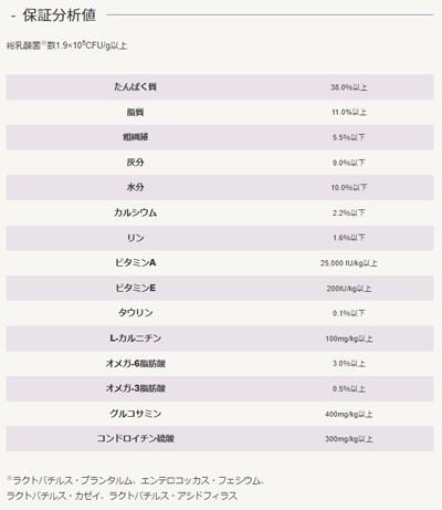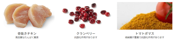 骨抜きチキン、七面鳥ミール、チキンミール、えんどう、じゃがいも、トマトポマス、粗挽き亜麻仁(オメガ-3脂肪酸源)、鶏脂(ミックストコフェロールで酸化防止)、チキンエキス、チコリ根抽出物、クランベリー、乾燥ケルプ、ラクトバチルス・プランタルム※、エンテロコッカス・フェシウム※、ラクトバチルス・カゼイ※、ラクトバチルス・アシドフィラス※、ユッカ抽出物、L-カルニチン、グルコサミン、コンドロイチン硫酸、ビタミン類(コリン、E、ナイアシン、A、B1、パントテン酸、B6、B2、D3、ビオチン、B12、葉酸、アスコルビン酸)、ミネラル類(亜鉛タンパク化合物、硫酸亜鉛、炭酸カルシウム、鉄タンパク化合物、硫酸第一鉄、硫酸銅、銅タンパク化合物、マンガンタンパク化合物、硫酸マンガン、亜セレン酸ナトリウム、ヨウ素酸カルシウム)、アミノ酸類(タウリン)、酸化防止剤(ミックストコフェロール、ローズマリー抽出物、緑茶抽出物、スペアミント抽出物)