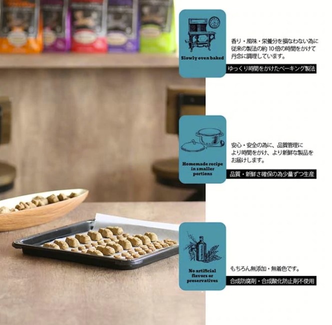 OVEN-BAKED TREATSはHACCP(ハサップ:人間の食品衛生管理システム)の認可を受けており、大切な愛犬に安心して与えられるおやつです。