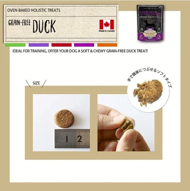 ■原材料 ダック(乾燥ダック16.3%、フレッシュダック8.19%)、ポテト、タピオカ、グリセリン、キャノーラ油(混合トコフェロール、クエン酸で保存)、サトウキビ糖蜜、ひよこ豆、エンドウ繊維、亜麻仁、塩、ホウレンソウ、りんご、バナナ、ブルーベリー、クランベリー、ブロッコリー、海藻、サツマイモ、ローズマリーエキス ■主な成分 粗タンパク質12%以上、粗脂肪11%以上、粗繊維3.5%以下、水分10%以下 ■カロリー 320kcal/100g(1トリート3.2kcal) Made in : Canada