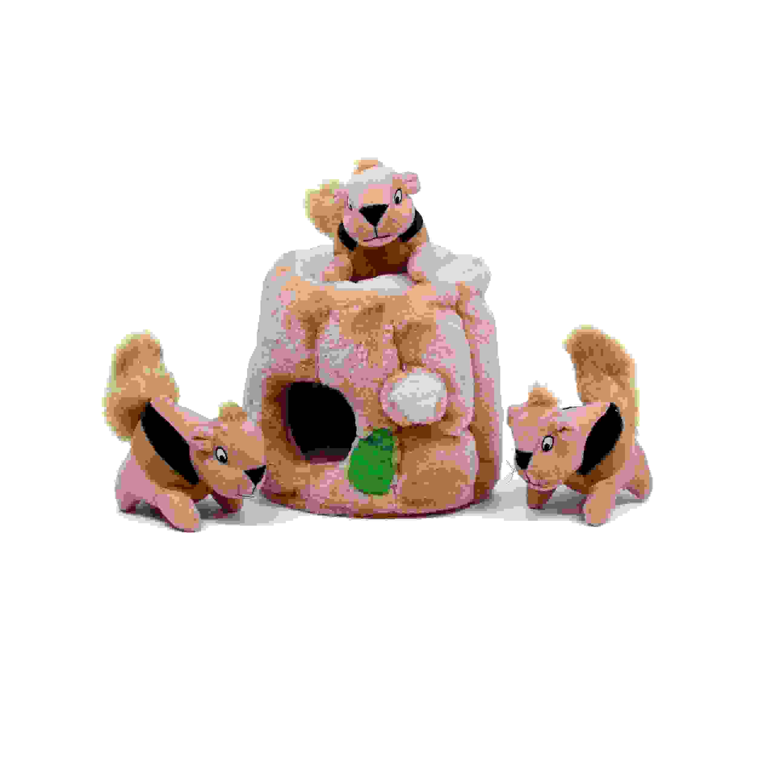 3 匹のキューキュー鳴るリスを切り株の中に入れて遊ぶことで、愛犬の狩猟本能を刺激します。