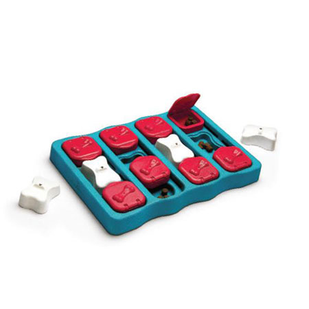 小さな穴の開いた骨型パーツの下にトリーツを入れ、クンクン嗅いで宝探し!慣れてきたらスライドする蓋付きパーツの下に隠して難易度アップも。