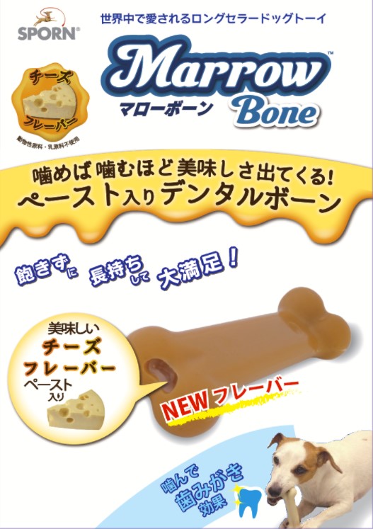遊びながら噛むことによりデンタルケアの出来る、機能的ドッグトーイの定番アイテム「マローボーン」にチーズフレーバーが登場! ボーンの中心にチーズフレーバーペーストを入れ込んだ全く新しいデンタルケア商品です。