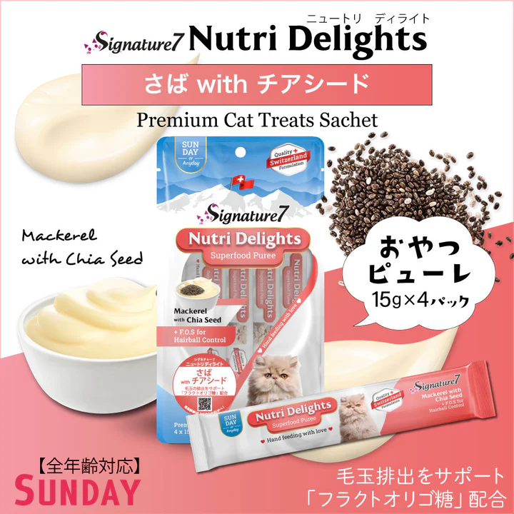シグネチャー7から猫用おやつピューレ新発売。・HACCP認証取得・スーパーフード配合・タウリン配合・人工着色料、人工香料、人工保存料は不使用ニャンコの味覚を満足させるおいしさ、濃厚なピューレハンドフィーディングタイプ。オーナーがスティックを手に持って与えるので愛猫との絆が深まります。