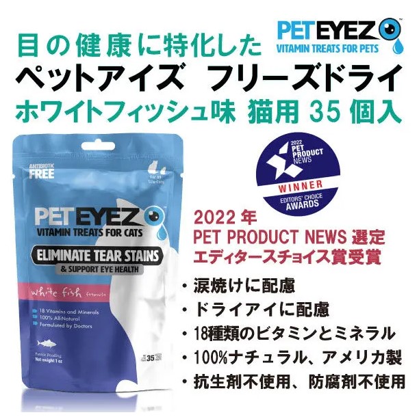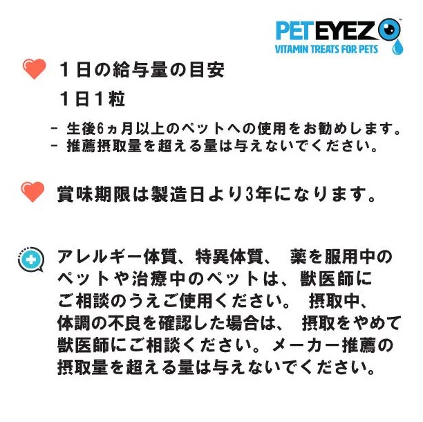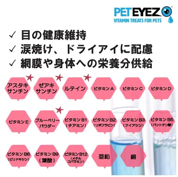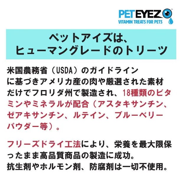 網膜や身体への栄養分供給18種類のビタミンとミネラル配合の目のサプリメントトリーツ。フリーズドライで嗜好性抜群の全米話題のペット用サプリメントトリーツ。アスタキサンチン、ゼアキサンチン、ルテイン、ビタミンA、ビタミンC、ビタミンD、ビタミンE、フルーベリーパウダー、ビタミンB1(チアミン)、ビタミンB2(リボフラビン)、ビタミンB3(ナイアシン)、ビタミンB5(パントテン酸)、ビタミンB6(ピリドキシン)、ビタミンB12(メチルコバラミン)、亜鉛、銅が配合され、強力に目の健康をサポートします。