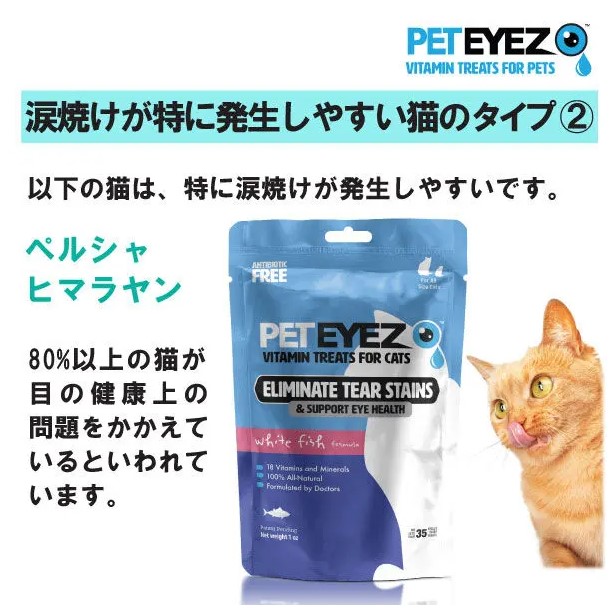 涙焼けが発生しやすい猫のタイプ全ての猫は涙にプルフィリン(porphyrin)を含有しており、このポルフィリンが赤色/黄色の沈着の原因。猫によっては涙にこのポルフィリン成分が多かったり、また白か薄い色の被毛の猫は涙焼けが目立ちやすいです。また、平たい感じの額の形をした猫種は涙焼けがより発生しやい傾向があります。以下の猫種が、特に涙焼けが発生しやすいです。ペルシャ、ヒマラヤン80%以上の猫が目の健康上の問題をかかえているといわれています。涙焼けの原因は?食事の問題 鼻涙管の詰まり 涙の過剰発生 逆さまつ毛(内皮症) 目や耳の炎症や病気、アレルギー、ストレス、歯の問題、水質、服用中の薬なども涙焼けの原因としてあげられます。目の健康のために正しいビタミンを使用することは、目の健康を維持し、生涯よい視力を保つことにつながります。また、これは涙焼け対策にもなります。