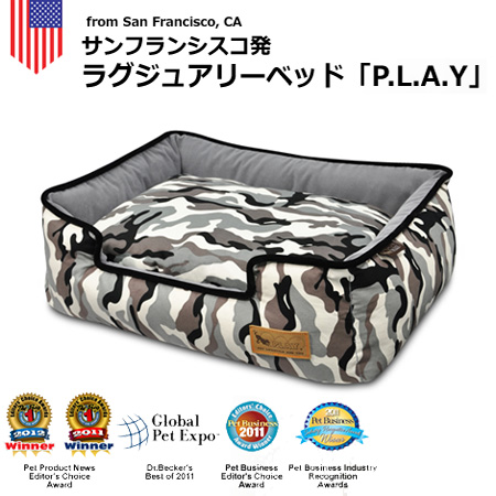 母親に抱かれているような安心感。あご乗せもできる”ラウンジベッド”体が沈み込むほどの柔らかいファイバーを箱型に詰め込んだ、P.L.A.Yの上位モデルベッドです。 従来比123%のファイバーを使用しているため、クッション性に富み、ペットの体をしっかりと受け止めます。ファイバーには再生ペットボトルでできている繊維を使用。通気性に優れているため、夏は涼しく、冬は暖かく、一年を通して快適なベッド環境を提供します。中心のクッションは取り外し可能で、ベット、クッションともカバーと中身を分けることができ、それぞれお洗濯が可能です。丁寧な作りとスタイリッシュなデザインのラウンジベッドは、P.L.A.Yを代表する高品質ベッドです。
