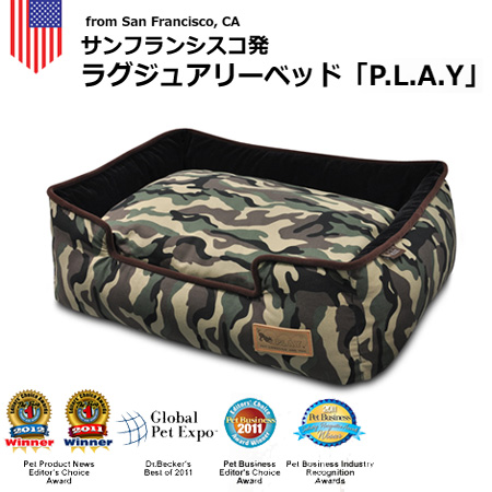 母親に抱かれているような安心感。あご乗せもできる”ラウンジベッド”体が沈み込むほどの柔らかいファイバーを箱型に詰め込んだ、P.L.A.Yの上位モデルベッドです。 従来比123%のファイバーを使用しているため、クッション性に富み、ペットの体をしっかりと受け止めます。ファイバーには再生ペットボトルでできている繊維を使用。通気性に優れているため、夏は涼しく、冬は暖かく、一年を通して快適なベッド環境を提供します。中心のクッションは取り外し可能で、ベット、クッションともカバーと中身を分けることができ、それぞれお洗濯が可能です。丁寧な作りとスタイリッシュなデザインのラウンジベッドは、P.L.A.Yを代表する高品質ベッドです。