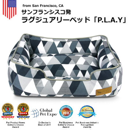 母親に抱かれているような安心感。あご乗せもできる”ラウンジベッド”体が沈み込むほどの柔らかいファイバーを箱型に詰め込んだ、P.L.A.Yの上位モデルベッドです。 従来比123%のファイバーを使用しているため、クッション性に富み、ペットの体をしっかりと受け止めます。ファイバーには再生ペットボトルでできている繊維を使用。通気性に優れているため、夏は涼しく、冬は暖かく、一年を通して快適なベッド環境を提供します。中心のクッションは取り外し可能で、ベット、クッションともカバーと中身を分けることができ、それぞれお洗濯が可能です。丁寧な作りとスタイリッシュなデザインのラウンジベッドは、P.L.A.Yを代表する高品質ベッドです。