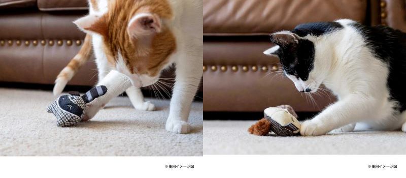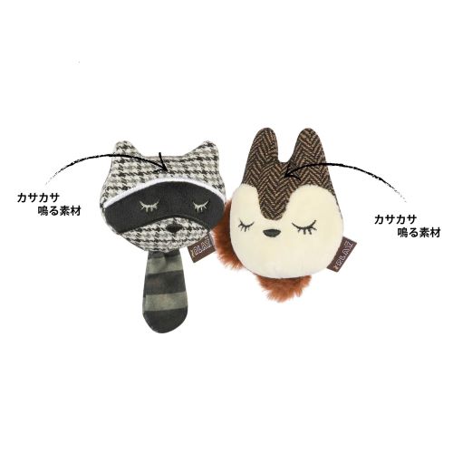 優しく瞼(まぶた)を閉じたアライグマとふわふわの尻尾がかわいいリスのおもちゃが2個1セットになっています。猫ちゃんが大好きなキャットニップと、カシャカシャ音がする素材を使っていますので、飽きずに遊ばせることができます。