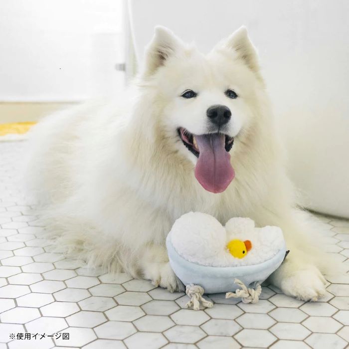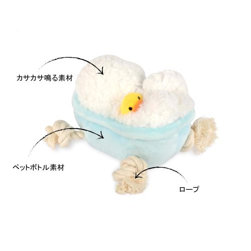 肌触りがよく、ワンちゃんの興味を惹きつける音が鳴ります。形や触り心地だけではなく、作り方にもこだわっており、子供用品と同等の品質基準で生産しています。少しでも丈夫な作りにするために、生地は2枚重ねにし、縫い目もダブルステッチ(2度縫い)を手作業でしています。クッション材には再生ペットボトル繊維を使用し、地球環境にも優しいおもちゃです。また、洗濯機で丸洗いができるので衛生的です。