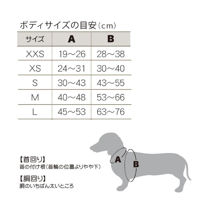 ■XXSサイズ(約):首回り:19~26cm、胴周り:28~38cm、背丈:15~23cm