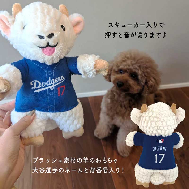 MLBの公式、大谷翔平選手モデルのペットグッズ。 メジャーリーグファン必見!! プラッシュ素材のゴート(羊)のおもちゃ、ドジャースのユニフォームを着て(刺繍)もちろん大谷選手のネームと背番号入り、 スキューカー入りで押すと音が鳴ります。