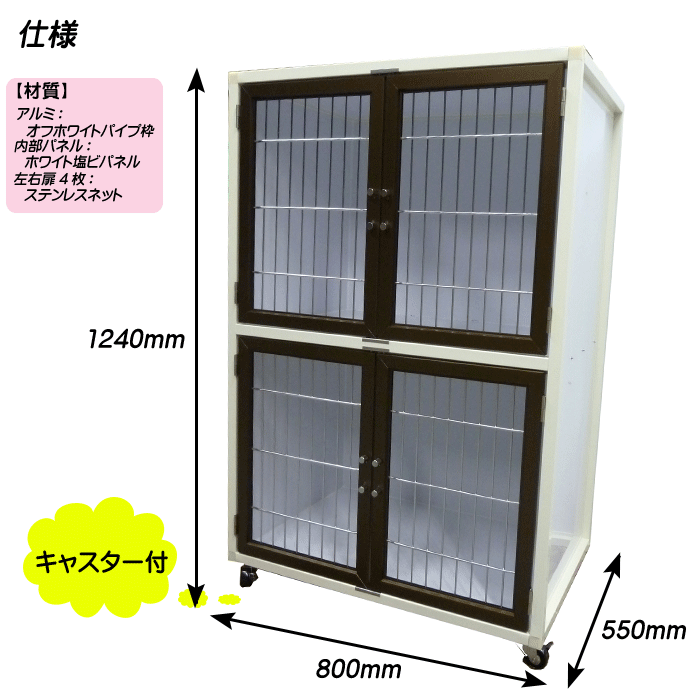 ●商品名:2段HOTEL犬舎 ダークブラック扉)HWDB800N●サイズ:W800×D550×H1240mm キャスター含む●外枠:アルミパイプオフホワイト●壁面:塩ビパネル●扉:ステンレスネット●販売元:PLASコーポレーション*仕様・性能は、予告なく変更する場合がありますのでご了承ください。。