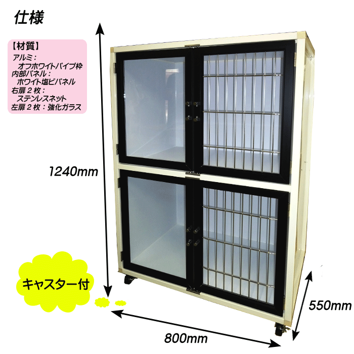 ●商品名:2段HOTEL犬舎 ブラック扉)HWB800G●サイズ:W800×D550×H1240mm キャスター含む●外枠:アルミパイプオフホワイト●壁面:塩ビパネル●扉:ステンレスネット(右) 強化ガラス(左)●販売元:PLASコーポレーション*仕様・性能は、予告なく変更する場合がありますのでご了承ください。。