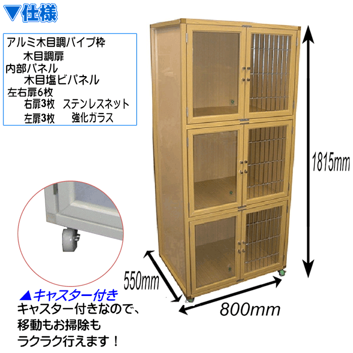 ●商品名:3段HOTEL犬舎 オール木目 HM800G●サイズ:W800xD550xH1815(キャスター含む)●材質: (アルミ)オフホワイトパイプ枠(内部パネル)ホワイト塩ビパネル(右扉3枚)ステンレスネット(左扉3枚)強化ガラス●販売元:PLASコーポレーション*仕様・性能は、予告なく変更する場合がありますのでご了承ください。