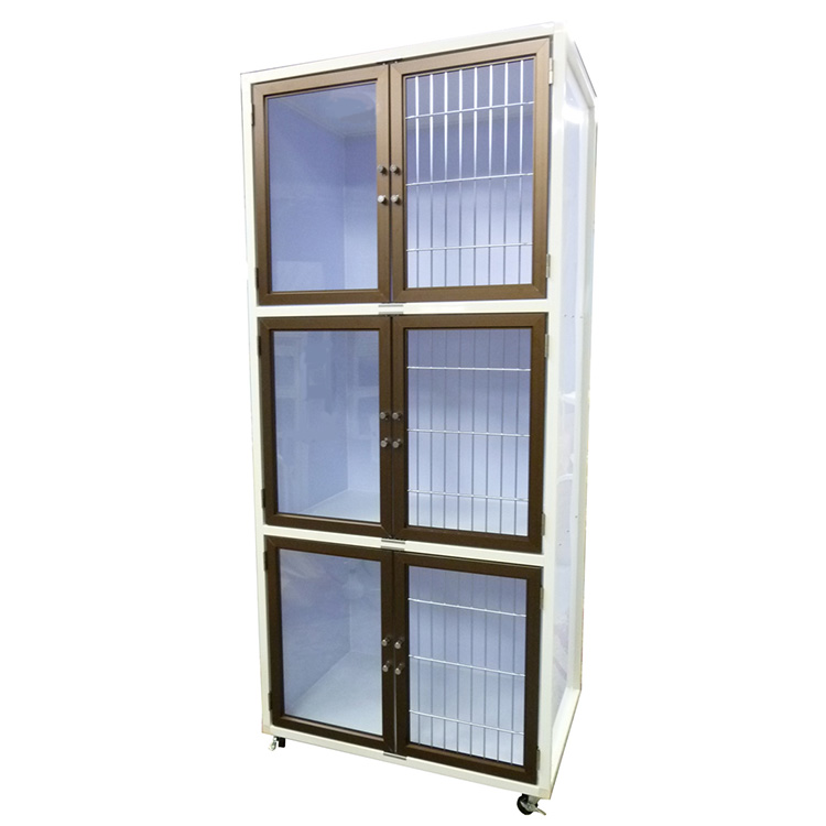 左扉が強化ガラスの3段犬舎 間仕切りありタイプ