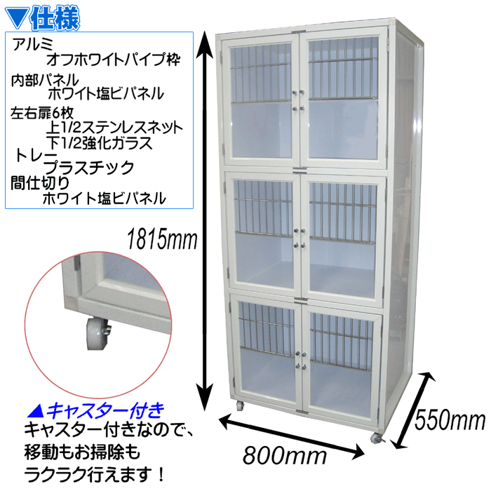 ●商品名:3段HOTEL犬舎 ホワイト扉 HW800GN●サイズ:W800xD550xH1815(キャスター含む)●材質:(アルミ)オフホワイトパイプ枠(内部パネル)ホワイト塩ビパネル(左右扉6枚)上1/2ステンレスネット 、下1/2強化ガラス●販売元:PLASコーポレーション*仕様・性能は、予告なく変更する場合がありますのでご了承ください。