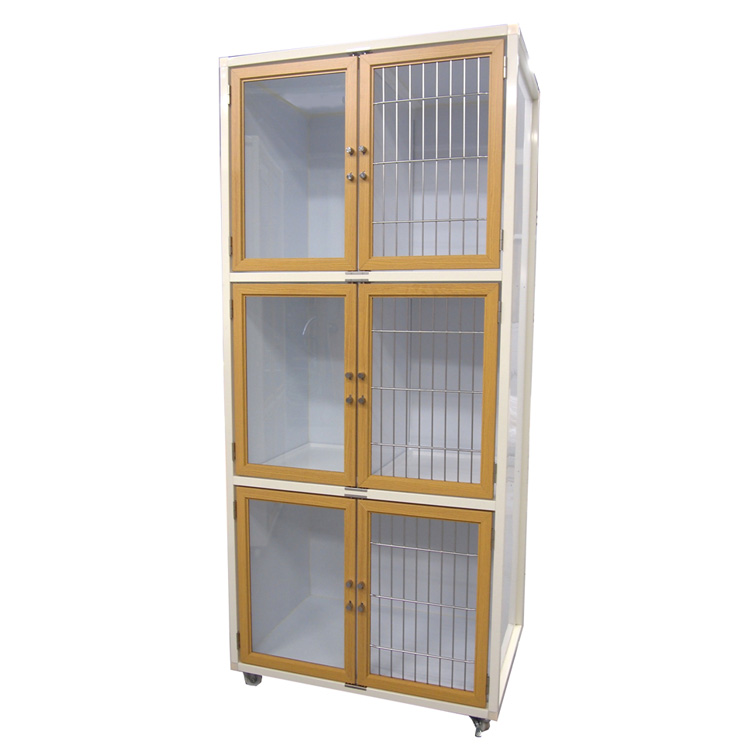 左扉が強化ガラスの3段犬舎 間仕切りありタイプ