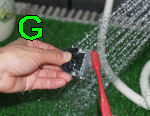 ・3~5分間駆動したらスイッチを切ります。本体から刃を取り外し中性洗剤を使い汚れを落とすように洗って下さい(G)。