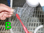 ・下刃と上刃をシャワーなどで水洗いします(B)。歯ブラシなどを使うとよりキレイに取れます。