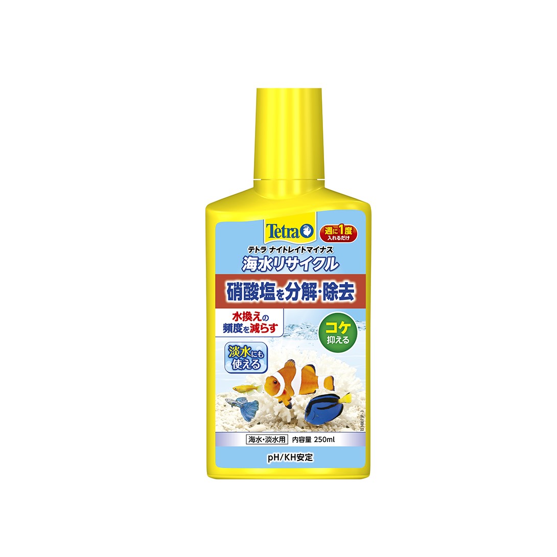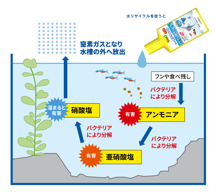 水槽の汚れ分解サイクルの働きにより生まれる硝酸塩は、水槽内に蓄積されると有害となり、水換えをしなければ取り除けません。ナイトレイトマイナスはこの硝酸塩を分解し、無害にするバクテリアを増やします。