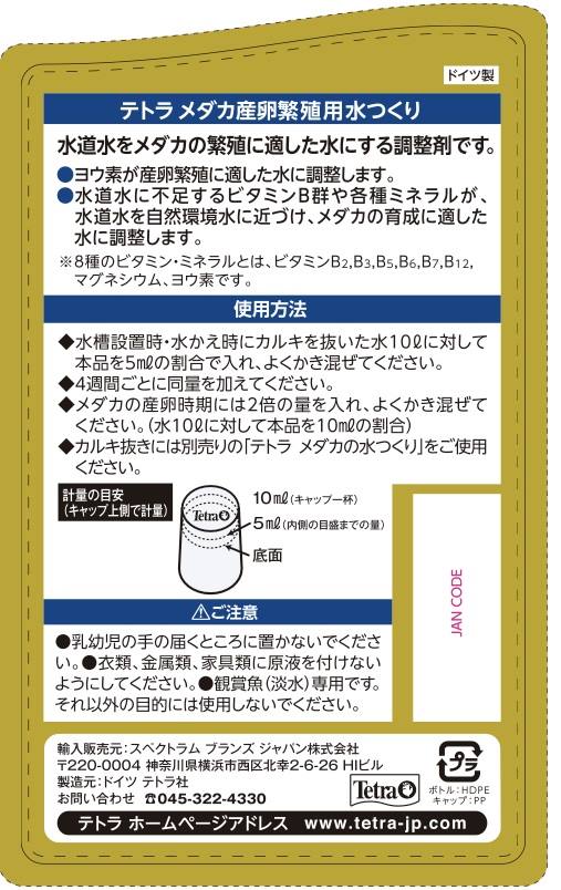 ●ヨウ素が産卵繁殖に適した水に調整します。●水道水に不足するビタミンB群や各種ミネラルが、水道水を自然環境水に近づけ、メダカの育成に適した水に調整します。※8種のビタミン・ミネラル含有(ビタミンB2B3B5B6B7B12マグネシウム、ヨウ素)