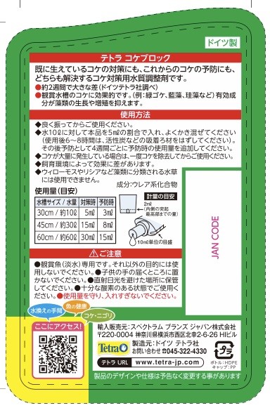 既に生えているコケの対策にも、これからのコケの予防にも、どちらも解決する水質調整剤です。鑑賞水槽のコケに効果的な有効成分が、藻類(例:緑ゴケ、藍藻、珪藻など)の成長や増殖を抑えます。