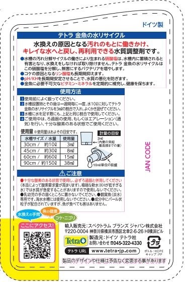 ●水槽の汚れ分解サイクルの働きにより生まれる硝酸塩は、水槽内に蓄積されると有害となり、水換えをしなければ取り除けません。金魚の水リサイクルはこの硝酸塩を分解し、無害にするバクテリアを増やします。●コケの原因となるリン酸塩も長期間抑えます。●pH/KHを長期間安定させることで、水質の悪化を防ぎます。●金魚に必要不可欠なビタミン・ミネラルを定期的に補充し、健康を保ちます。