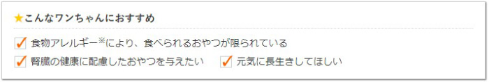 えび、かに、小麦、鶏卵、乳、牛肉、大豆、鶏肉、豚肉、ゼラチンを使っていないので、該当成分に食物アレルギーがあり、おやつ選びが難しいワンちゃんにも安心して与えることができます。