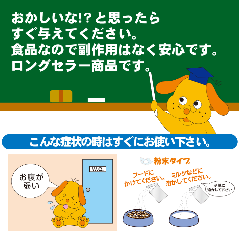 与え方 ※こういう時にお与えください ●ペットの糞が柔らかい、固すぎる時。 ●散歩中に草を食べるようになった時。 ●糞の回数が多くなった時。 少量の水やミルクに溶かして与えてください。 日頃から下記の半分の量を毎日与え続けることをオススメします。