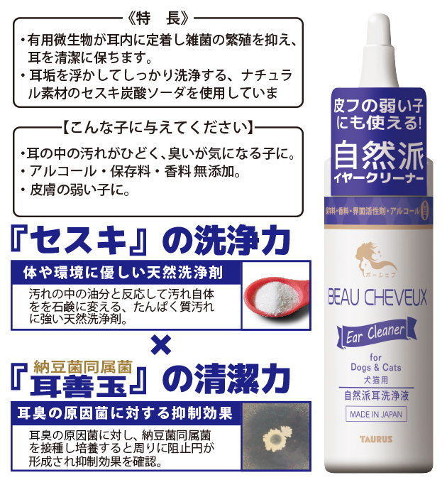 ◆有用微生物が耳内に定着し雑菌の繁殖を抑え、耳を清潔に保ちます。