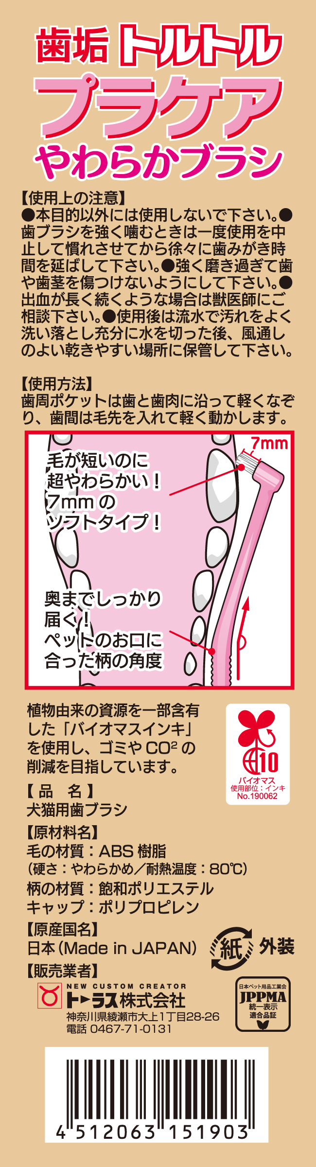 特長 ●毛が短いのに超やわらかい。 7mmの ソフトタイプです。 ●奥までしっかり届く、ペットのお口に合った柄の角度。 ●プラスチックごみを削減するために、環境に良い紙のパッケージを使用しています。 ●植物由来の資源を一部含有した「バイオマスインキ」を使用しています。