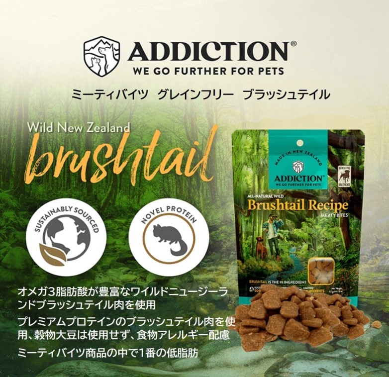 オメガ3脂肪酸が豊富な、ワイルドニュージーランドブラッシュテイル肉を使用。 プレミアムプロテインのブラッシュテイル肉を使用。 穀物と大豆を使用せず、食物アレルギーに配慮。 ミーティバイツ商品の中でいちばんの低脂肪。