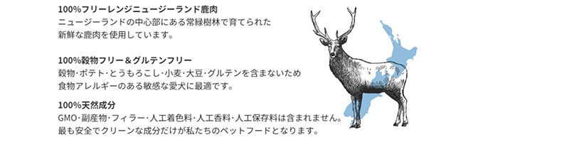 世界で最もクリーンな国の1つであるニュージーランドの豊かな自然から、風味豊かなフリーレンジ(放し飼い)の鹿肉を愛犬に。
