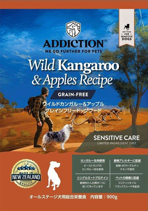 アディクションワイルドカンガルー&アップルは、全てのライフステージの愛犬が「Addiction(やみつき)」になり、家族みんなが喜びを感じられる食事の時間を贈ります。