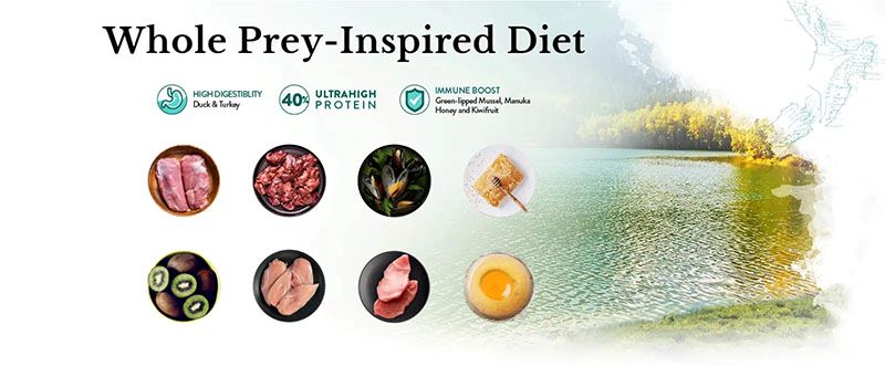 鴨生肉、七面鳥生肉、鶏生肉、緑イ貝とマヌカハニーを配合した高タンパクグレインフリーフード