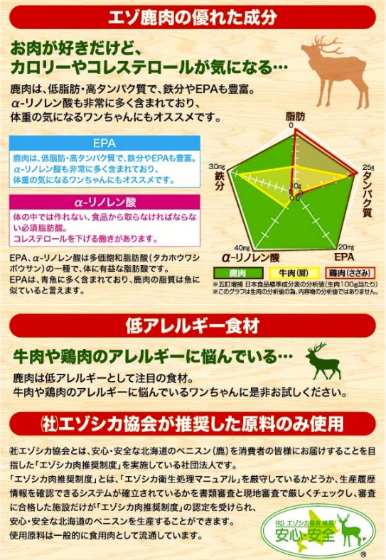 鹿肉は低アレルギーとして注目の食材。牛肉や鶏肉などのアレルギーに悩んでいるワンちゃんにオススメです。