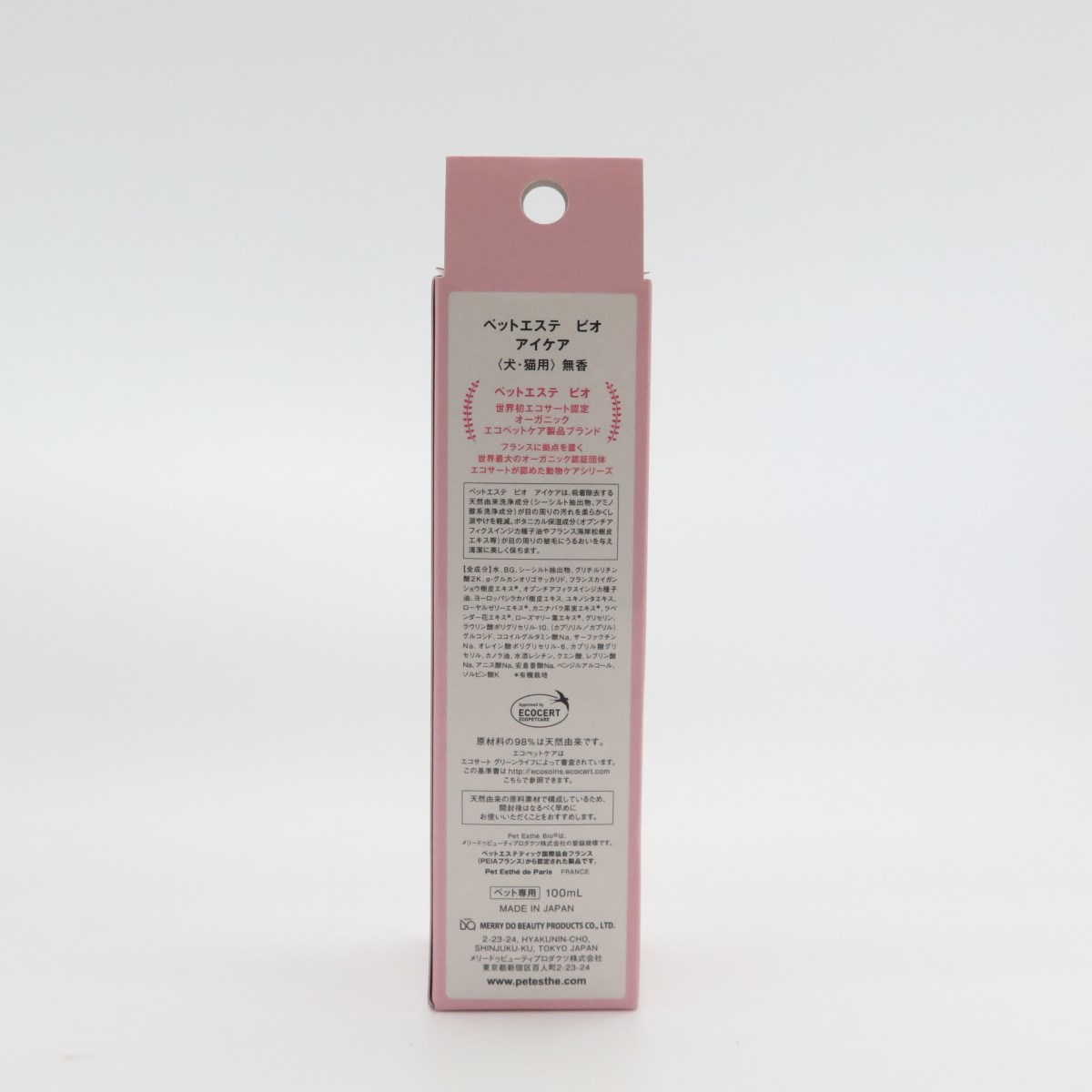 ペットエステ ビオ アイケアは、吸着除去する天然由来洗浄成分(シーシルト抽出物、アミノ酸系洗浄成分)が目の周りの汚れを柔らかくし涙やけを軽減。ボタニカル保湿成分(オブンチアフィクスインジカ種子油やフランス海岸松樹皮エキス等)が目の周りの被毛にうるおいを与え清潔に美しく保ちます。