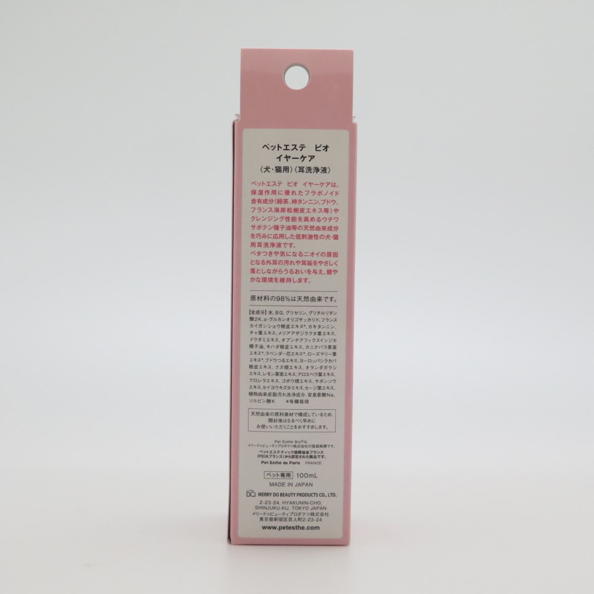 保湿作用に優れたフラボノイド含有成分(緑茶、柿タンニン、ブドウ、フランス海岸松樹皮エキス等)やクレンジング性能を高めるウチワサボテン種子油等の天然由来成分を巧みに応用した低刺激性の犬猫用耳洗浄液です。