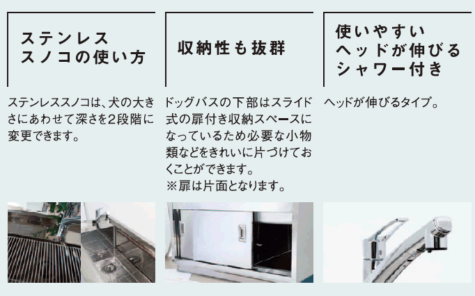 シャワー、扉付き収納、ステンレススノコ、樹脂スノコ、シリコンマット、防臭排水トラップ、フラットプレートが標準装備
