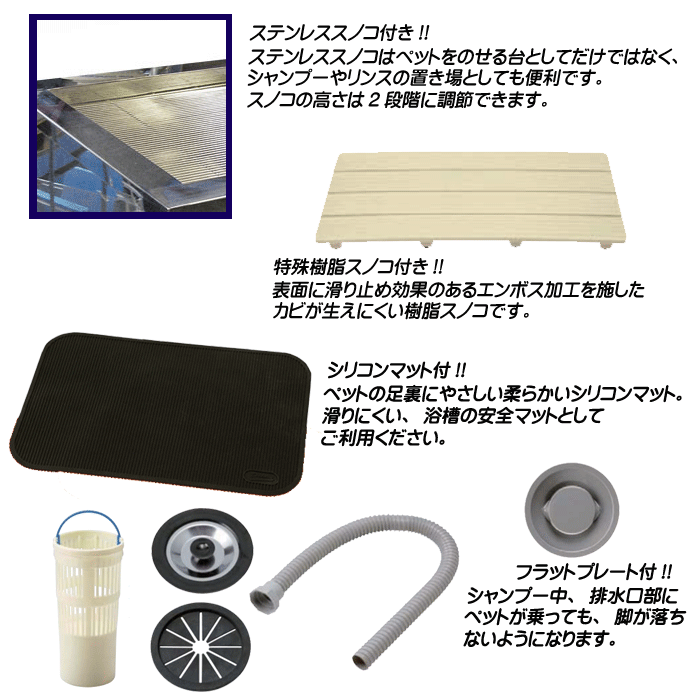 【バス選びに付いて】どのような犬種を主にするのか、スペース等を検討してサイズをお選び下さい。バスが余り大きすぎるとペットが動いて作業がしづらくなります。適度なサイズをお選び下さい。多犬種を想定される場合は大小2台をオススメします。人手、作業スピードによりまして必要台数をご検討下さい。大体の場合乾燥の方がより手間と時間が掛かる事が多いです。【設置に付いて】オーバーフロー、排水坑側のどちらにペットの頭が来るようにしたいか、作業効率を考えて決定してください。取り付けは基本的には置くだけです。アンカー固定などは通常不要です。バスに水を張る場合は重量が掛かりますので、考慮して設置場所を決定してください。水道蛇口の為の穴等はバスにはございません。蛇口、シャワーの位置関係を考慮し設置場所を決定してください。排水坑に付いて:工事業者様と相談してなるべくストレートに排水坑に接続してください。途中で排水が溜まると悪臭の発生源となります。(ストレート配管が難しい場合は付属のジャバラホースが伸びますので調整して排水管に差し込んでください。)配管に付きましてはご不明の場合は弊社が業者にご連絡いたします。壁際に置く場合、(廻りが壁紙の場合等)は濡れて壁紙が剥がれてきたりしますので、バスの廻りの壁に水切り、(ステンレス材、タイル等)を必要であれば貼り付けてください。床面はタイルかモルタルで排水処置を行ってください。店舗が上層階の場合は床面の排水に付いては充分留意して下さい。設置場所により脚は先端がネジ状になっており水平は取れるようになっています。*ご使用後は砂などを良く流してください、砂は鉄分を含むことがあり、長時間バス内に錆びた砂を放置すると、バスにサビが移る場合があります。