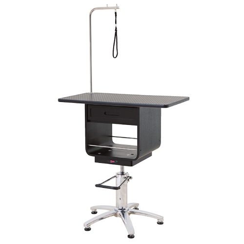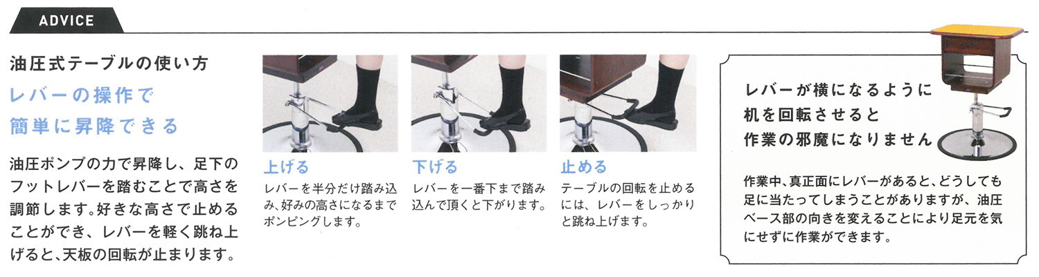 フットレバーを踏み、無断階に高さの調整が可能の油圧式テーブル。昇降部→775~890mm